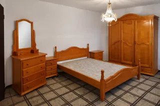 Conjunto de muebles de dormitorio de madera maciza. - Cama de matrimonio con somier, cabecero y pie. Colchón incluido si se quiere. - Dos mesitas de noche con superficie de marmol. - Armario de seis puertas. - Cómoda con cuatro niveles de cajones y superficie de marmol. - Espejo - Silla