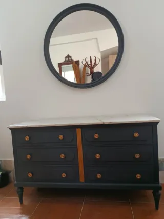Conjunto de dormitorio con cómoda y espejo. Este conjunto de muebles de madera de haya ha sido recientemente restaurado y pintado a mano, el cuerpo principal es de color antracita con detalles en pintura anti que gold, interior de los cajones en Royal Grey y tiradores de bronce. Este conjunto está coronado por una losa de mármol veteado. El precio es negociable. - Cómoda de madera con detalles dorados. - Encimera de mármol veteado dorado - Espejo con marco en madera color antracita.