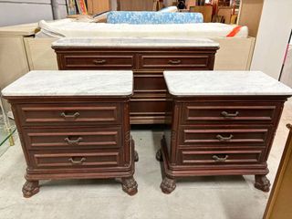 Conjunto de dormitorio de estilo clásico con acabados en madera oscura y detalles de mármol. - Armario de gran capacidad, 3 cuerpos, con puertas de madera. - Cama con cabecero curvo, estructura de madera y somier de láminas - 2 Mesitas de noche con superficie de mármol. - Cómoda con superficie de mármol. - Espejo en madera