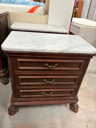✅ Ref. B10987 Cómoda y dos mesitas de noche fabricadas en madera de buena calidad de color marrón oscuro. Se trata de una cómoda que tiene dos cajones alargados y dos más pequeños y dos mesitas de noche que cuentan con tres cajones cada una. Los tres muebles cuentan con una superficie rectangular marmolada y resultan ideales para colocarlos en un dormitorio de matrimonio. Como se puede observar en las fotografías se encuentran en buenas condiciones. 📐 Medidas Cómoda (ancho x fondo x alto): 116x46x75cm. Mesitas 58x43x60cm. Financia tus compras de forma inmediata. Visita nuestra web Cardiffstore o nuestra tienda en Baza