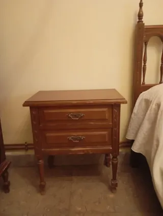 Dos mesitas de noche de madera con dos cajones. Cama completa con somier y colchón. 1'35 m. Armario con 3 puertas. Cajones por dentro. Cómoda con cajones. Descalzadora - Acabado en madera de tono cálido. - Tiradores metálicos decorativos. - Patas talladas con diseño.