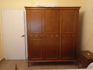 Se vende dormitorio/habitación completo de matrimonio en madera maciza/chapada, estilo clásico y en buen estado. Incluye: • Armario de 3 puertas abatibles con altillo y cajones inferiores. Medidas: 185 cm alto x 165 cm ancho x 55 cm fondo. • Cama de matrimonio con cabecero y pie de madera + somier de base rígida. Medidas: 180 x 140 cm. • 2 mesitas de noche con 3 cajones cada una. Medidas: 60 x 48 x 32 cm. • Tocador/cómoda con 3 cajones. Medidas: 80 x 80 x 40 cm. • Espejo a juego con base con 2 cajones. Medidas: 100 x 65 cm. Se vende todo junto. El comprador debe venir a desmontar y recoger.