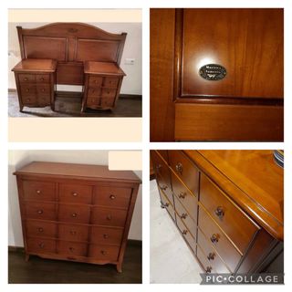 Conjunto de dormitorio en madera de cerezo macizo, calidad extraordinaria, fabricados en España, marca reconocida. Tiene alguna señal del tiempo sin importancia que no afecta a la óptica del mueble. Incluye cabecero de 1,50cm , dos mesitas de noche y cómoda a juego. Si quieres un dormirorio de madera noble de calidad este es el tuyo. Solo recogida en persona, transporte a cuenta del comprador. Encantados te podemos recomendar a un transportista de confianza.
