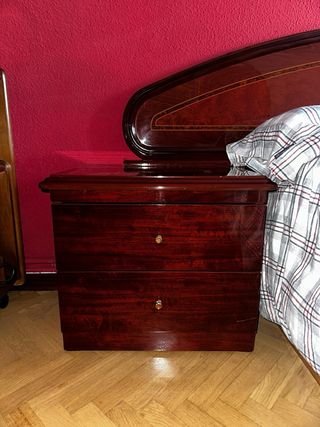 Conjunto de dormitorio completo en madera oscura. Incluye cama, cabecero, mesitas de noche y cómoda con espejo - Cama de matrimonio de 190x135 con canapé y cabecero de madera con hendiduras en los laterales para acoplar las mesitas de noche. - Dos mesitas de noche con cajones. - Cómoda de tres cajones con espejo acoplado. Se recoge en un 11º con ascensores. Se vende por reforma integral de la vivienda. Precio negociable.