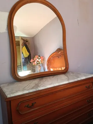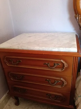Conjunto de muebles de dormitorio de estilo vintage, con acabados en madera y detalles de mármol. - Cómoda con superficie de mármol. - Espejo con marco de madera,con defecto - Diseño clásico y elegante. -2 mesillas con superficie de marmol -cama
