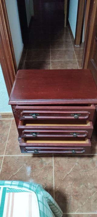 Preciosa cómoda y dos mesitas de noche de estilo vintage. Ideales para un dormitorio con encanto. - Piezas de madera maciza. - Diseño clásico con tiradores de metal. - La cómoda tiene tres cajones. - Mesitas de noche con un cajón cada una. - Se encuentran en buen estado, con algunas señales normales de uso.