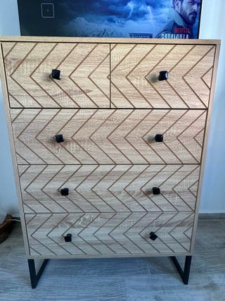 Mueble de dormitorio con diseño moderno y funcional. - Patas metálicas en forma de V. - Frontales con diseño de espiga. - Tiradores cuadrados negros.