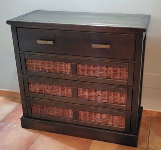 Vendo cómoda de madera en muy buen estado, ideal para dormitorio, salón o entrada. Tiene 4 cajones amplios y una puerta abatible tipo escritorio, perfecta para guardar documentos o usar como pequeño secreter. Medidas: Largo/ancho: 75 cm Alto: 104 cm Fondo: 34 cm Mueble robusto, de estilo clásico y con herrajes decorativos. Perfecto para quien busca una pieza con carácter y buena capacidad de almacenamiento. Recogida en mano.