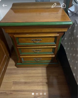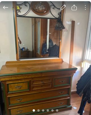 Mueble de dormitorio de madera con un diseño clásico y elegante. Incluye un espejo. - Acabado en madera brillante. - Detalles en verde en los cajones y bordes. - Tiradores metálicos. - Múltiples cajones para almacenamiento. Vendo dormitorio completo : Comoda con espejo Cabecero 2 mesitas de noche