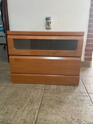 Mueble de dormitorio de madera con un diseño moderno y funcional. Ideal para organizar tus pertenencias. - Acabado en madera clara. - con cajones de cristal translúcido. Mueble bajo 4 cajones Alto 45 Ancho 120 Fondo 40 Cómoda 6 cajones Alto 110 Ancho 60 Fondo 40 Mesa de noche 2 cajones Alto 45 Ancho 60 Fondo 40 Mesa de noche doble 6 cajones Ancho total 63 M. 1 Alto 78 Ancho 23 Fondo 40 M. 2 Alto 45 Ancho 40 Fondo 40