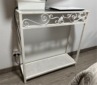 SOLO ALBACETE EN MANO Elegante mesita auxiliar con estructura de hierro, detalles decorativos y cristal translúcido. - Acabado pintado en blanco roto/gris. - Superficie de cristal translúcido. - Estante inferior perforado (fue pintado a mano y en las foto se aprecia como esas imperfecciones son pintura dentro de los agujeros)