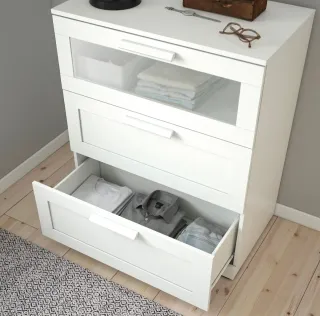 Cómoda BRIMNES de IKEA con tres cajones. Su diseño moderno y funcional se adapta a cualquier habitación. PRECIO MUY REDUCIDO SI SE COMPRA LOTE DE MUEBLES Y ELECTRODOMÉSTICOS DE MI PERFIL PARA AMUEBLAR PISO. - Cajones amplios para almacenamiento. - Frontal de cajón con vidrio. - Tiradores integrados.