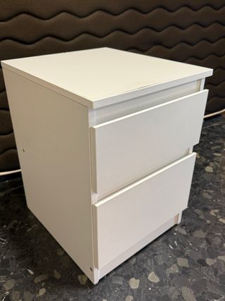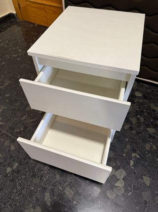 Mesita de noche MALM de Ikea en color blanco. Cuenta con dos cajones para almacenamiento. - Diseño moderno y funcional. - Acabado liso y fácil de limpiar. - tiene pequeñas marcas en alguna esquina y en los cajones por dentro