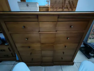 Preciosa cómoda tocador de madera, en buen estado. Ideal para dormitorio. - Tiene un cajón pequeño y dos cajones grandes. - Incluye un espejo. - Perfecta para guardar ropa y accesorios. El cajón pequeño mide 50 de ancho La estantería mide 87 de ancho por 31 Del suelo a la estantería mide 70
