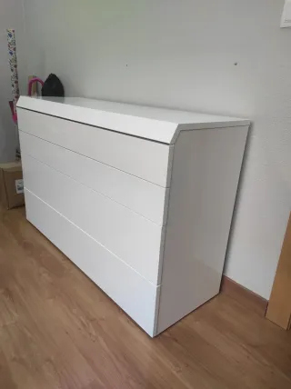 Mueble sinfonier de la marca TRAMA con cuatro cajones y ruedas para moverlo. - Diseño moderno y funcional. - Tiradores redondos, habria que cambiarlos y poner los que te gusten - Acabado en color blanco. Se puede utilizar de bañera para bebe.