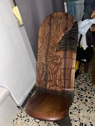 Silla de madera con un diseño único y tallado a mano. - Respaldo con escena tallada. - Asiento cómodo y robusto. - Piezas de madera maciza.
