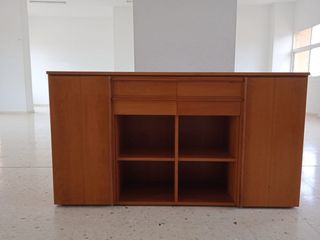 Cómoda de estilo vintage con un diseño clásico y elegante. Está ra restaurar, no está rota, solo le falta pintarla Medidas 161 centímetros de ancha 74 de alta y 38 de fondo - Dos puertas con lamas y tiradores negros. - Cuatro cajones con tiradores negros. - Patas de madera con diseño curvo.