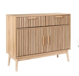 Cómoda de tres cajones con un diseño moderno y elegante. Sus patas inclinadas le dan un toque nórdico. - Frontales de cajón con relieve hexagonal. - Tiradores metálicos discretos. - Patas cónicas de madera. - Comprada en El Corte Inglés.