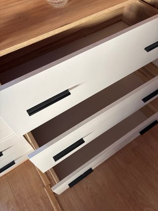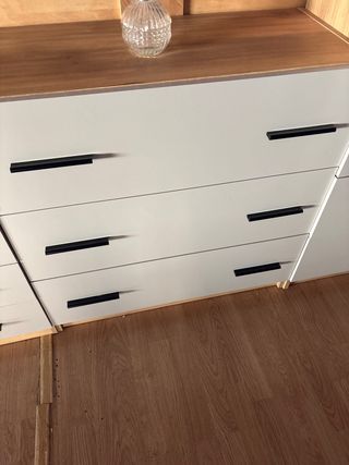 Cómoda de seis cajones con un diseño moderno y elegante. - Seis cajones amplios para almacenamiento. - Acabado liso y mate. - 4 cajones grandes - 2 cajones pequeños dividíos en dos cada uno. Esta medio montada. Conversa manuel de instrucciones y piezas. En venta porque no tengo espacio.