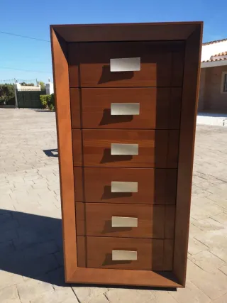Cómoda de madera con 7 cajones en buen estado Vendo cómoda de madera con varios cajones, muy práctica para guardar ropa, documentos o cosas del hogar. Está en buen estado y los cajones abren y cierran bien. Diseño bonito en madera con tiradores metálicos. Medidas aproximadas: 65 cm ancho, 105 cm alto, 42 cm fondo. Ideal para dormitorio, despacho o habitación. Precio económico, se vende por cambio de muebles. Se puede ver sin compromiso