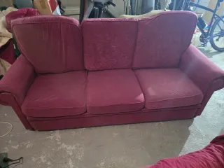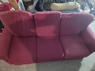 Sofá de tres plazas en bonito color granate. Tapizado en tela tipo chenilla, de tacto suave y agradable. Es un sofá cómodo y amplio, ideal para salón, piso de alquiler, garaje o segunda vivienda. Presenta signos normales de uso propios del tiempo (ver fotos), pero está en buen estado general y es totalmente funcional. Cojines desenfundables. Solo recogida en mano en Almería. Precio económico porque necesito quitármelo de encima.