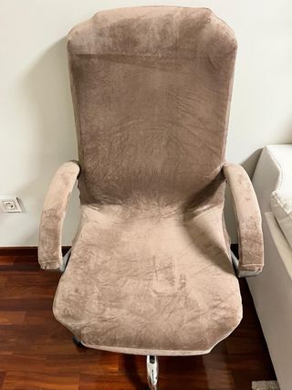 Silla giratoria de oficina. Se vende con la funda marrón de la fotografía (la funda está nueva, apenas tiene uso) ya que por debajo es de piel sintética y está muy estropeada (uso, arañazos, etc 😼) el respaldo es acolchado y es muy cómoda