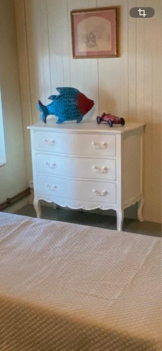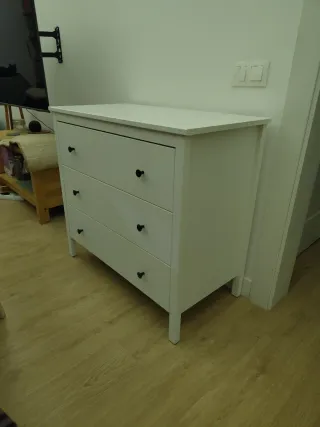 Cómoda de tres cajones de Ikea. En buen estado pero tiene una ligera mancha en la parte superior y un roto en un lateral del cajón que no afecta el funcionamiento (solo se ve si se abre el cajon por fuera). Uno de los tiradores debe cambiarse.