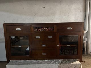 Mueble de madera con un diseño elegante y funcional.Mas de la misma coleccion en mi perfil. - Amplios cajones para almacenamiento. - Puertas con cristal para exhibir objetos. - Acabado en tono marrón oscuro.