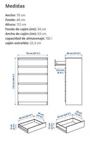 Cómoda de IKEA con un diseño moderno y funcional. Tiene algunas marcas por el uso, como se aprecia en las fotos, pero está bien conservada. Se vende montada y la persona compradora tendría que venir a recogerlo.