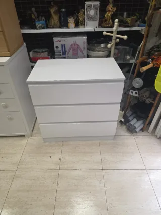 Cómoda de tres cajones de la marca Ikea, modelo Malm. Adjuntadas fotos de todas las marcas/deterioros que tiene del uso. Se entrega asi. - Diseño moderno y funcional. - Acabado en color blanco. - Fabricada en madera.