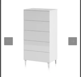Cómoda alta con un diseño moderno y elegante. - Cinco cajones amplios para almacenamiento. - Patas cónicas que le dan un toque estilizado. - Acabado liso y brillante. Las fotos son de la web ya que está sin montar y sin sacar de su caja. El único problema que tiene es que tiene alguna esquina tocada por el transporte. (Tengo fotos de los daños) Su precio era de 124,99€ en la web (de oferta).