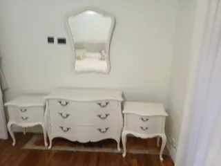 Conjunto de muebles de dormitorio que incluye una cómoda, dos mesitas de noche y un espejo. - Cómoda con tres cajones. - Mesitas de noche con dos cajones cada una. - Espejo con marco decorativo.