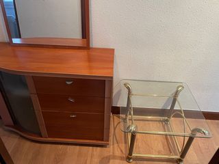 Conjunto de cómoda y mesa de salón. - Cómoda con cajones. - Mesa auxiliar con sobre de cristal . Están en un muy buen estado y el precio sería 30c/u. Si está interesada o interesado llamar al 647645842