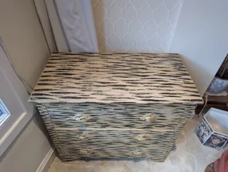 Cómoda de madera con un llamativo estampado de cebra en tonos beige y negro. Su diseño vintage le da un toque único a cualquier habitación. - Patas con diseño curvo. - Tiradores concha. - Acabado desgastado.
