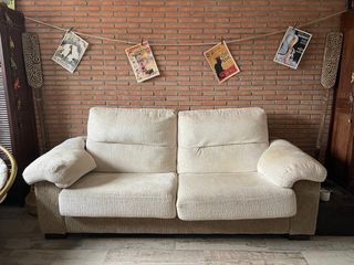 Este sofá de tela es muy cómodo y se encuentra en perfecto estado. Su diseño combina tonos beige y marrón, aportando calidez a cualquier estancia. - Estructura de madera resistente. - Tapicería de tela suave al tacto.