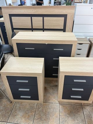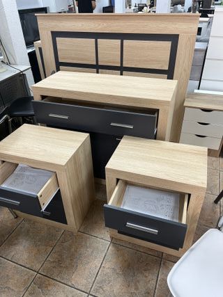 para saber mas escribe a 697*204*421- maria Pagas al recibirlo! 📦 Vienen en caja nuevo. ☎ ATENDEMOS WHATSAPP 24H ✅Totalmente nuevo y con 2 años de garantia Conjunto de muebles de habitación con un diseño moderno y elegante. - Cabecero de madera con detalles en negro. - Cómoda con cajones. - Dos mesitas de noche a juego.