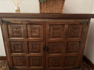 Mueble auxiliar de madera con un diseño rústico y elegante. Ideal para dar un toque especial a tu hogar. - Acabado en tono marrón oscuro. - Tres cajones superiores. - Dos puertas inferiores con tiradores de forja. - Base robusta. Se recoge a pie de calle portal vendedor