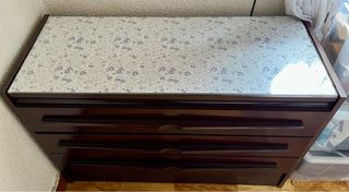 Cómoda antigua con un diseño elegante y funcional. ❗️Tengo también las mesitas a juego, lo podría vender junto a un precio rebajado. - Tres cajones amplios para almacenamiento. - Acabado en madera oscura. - Encimera de cristal.