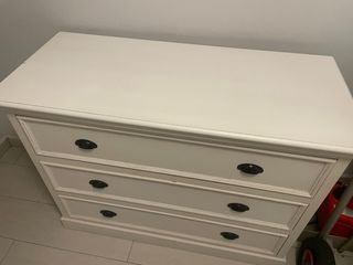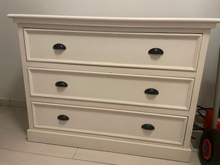 Cómoda de madera con un acabado en blanco. Cuenta con varios cajones para almacenamiento. - Tiradores decorativos. - Diseño clásico. Las medidas son: Ancho: 1 metro, alto: 92. Fondo: 42 La compré en kenay home por 295 euros. Tiene algunos pequeños toques pero es muy bonita y está bien