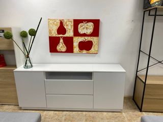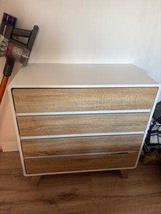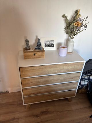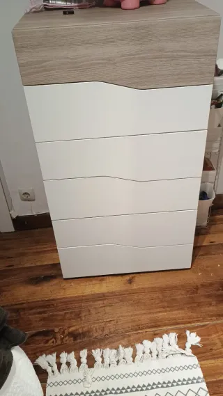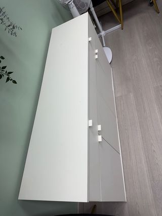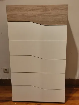 Está nueva, recién montada. Se vende por motivos personales, que han hecho que ya no lo necesite. Cómoda con un diseño moderno que combina un acabado blanco con detalles en madera. - Cajones con tiradores integrados. - Patas estilizadas.