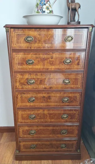 Mueble de madera con varios cajones y un diseño elegante.tambien posibilidad de espejo a juego por 60 euros - Tiradores metálicos. - Detalles de marquetería.