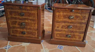 Elegante sinfonier de madera con un diseño clásico y acabados de calidad. - Cajones con tiradores metálicos. - Detalles de marquetería en los frentes. - Estructura robusta. mesillas 10 euros cada una. Medidas 59x52x33,5 se puede vender por separado. precio conjunto 60. precicio somier separado 50.