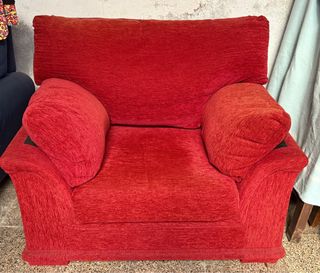 Par de butacas con un diseño elegante y cómodo. - Tapicería de tela en tono rojizo. - Estructura de madera con acabado natural. - Asientos amplios y confortables. 1 a 30€ . Las 2 a 50€