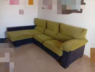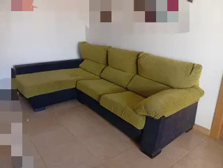 Sofá chaiselongue con un diseño moderno y cómodo. - Tapicería en tela. - Combinación de colores verde y negro. - Sillones deslizables para más amplitud. Ha estado cubierto con funda.