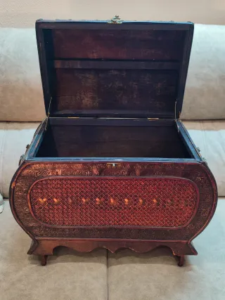 Elegante cofre con un diseño intrincado y detalles dorados. - Altura 46-47 CMS Anchura 55-56: CMS Profundidad 32 CMS - Elaborado con una combinación de madera y bambú. - Tapa curva con patrón de tejido. - Frontal con relieve y adornos. - Base con patas curvas. -El color es más cómodo las últimas Fotos (No tan rojizo como sale en las primeras fotos ...)