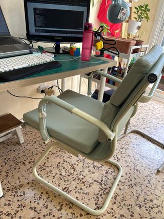 Silla de oficina con un diseño moderno y funcional. - Base con ruedas para fácil movilidad. - Respaldo ergonómico para mayor comodidad. - Brazos integrados. - El único desperfecto que tiene es el de la última foto, por lo demás está perfecta. Muy cuidada