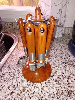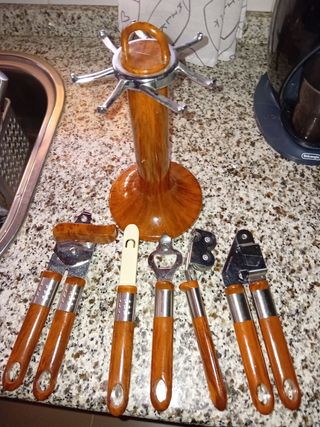 Conjunto de peladores de cocina con mangos de madera y detalles metálicos. - Diseño ergonómico para un agarre cómodo. - Incluye varios tipos de peladores para diferentes usos.