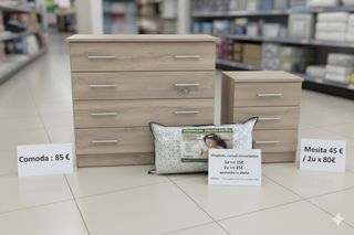 Cómoda 85€ , Mesita de Noche 80€ , Almohada 25€