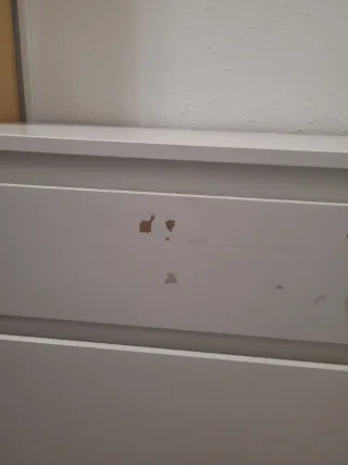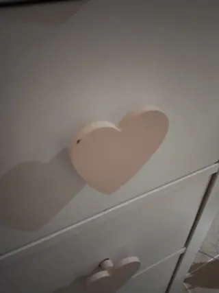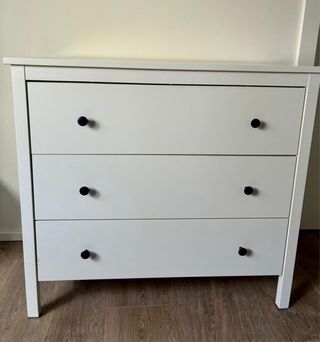 Cómoda de tres cajones de la serie Hemnes de Ikea. Tres cajones amplios. Tiradores cambiados con corazones. Patas estilizadas. Tiene una esquina desconchada pero es de un protector que puse.