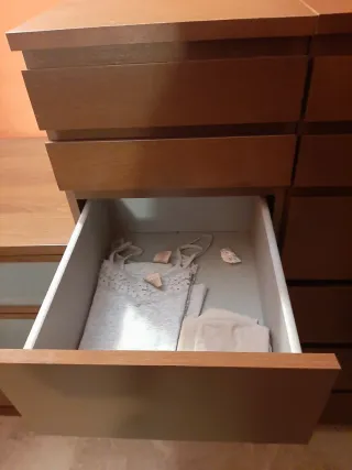Se vende conjunto de muebles de dormitorio y almohada. - Cómoda de 5 cajones. - Mesita de noche de 3 cajones. - Almohada viscoelástica. - Comoda 85 € - Oferta: 2u de Almohadas por 25€. - Oferta: 2u de Misitas 80€